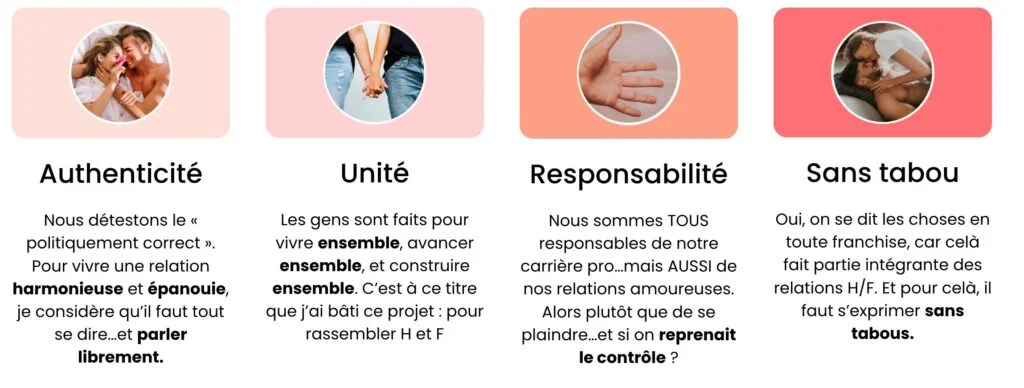 L’angle « regard masculin » est un vrai différenciateur — aucune concurrente directe ne le propose de façon aussi frontale. Les témoignages le confirment : ce que les femmes retiennent le plus, c’est la prise de conscience sur leurs propres comportements, pas les conseils « comment séduire ».